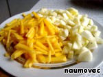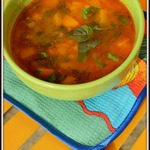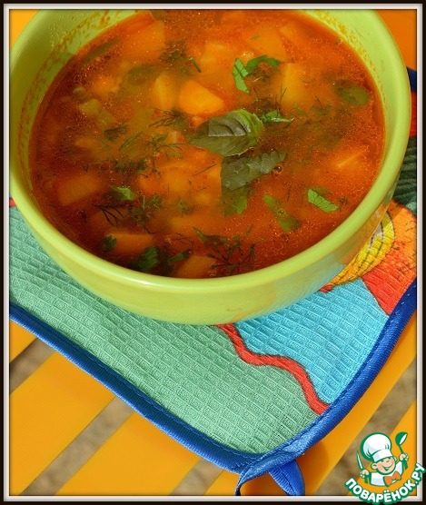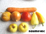 Добавляем в кастрюлю репу и яблоки, через 5-10 минут - перец и морковь. Сухари прокаливаем на чистой сковородке и добавляем помидор, готовим минуты две и добавляем в кастрюлю.
