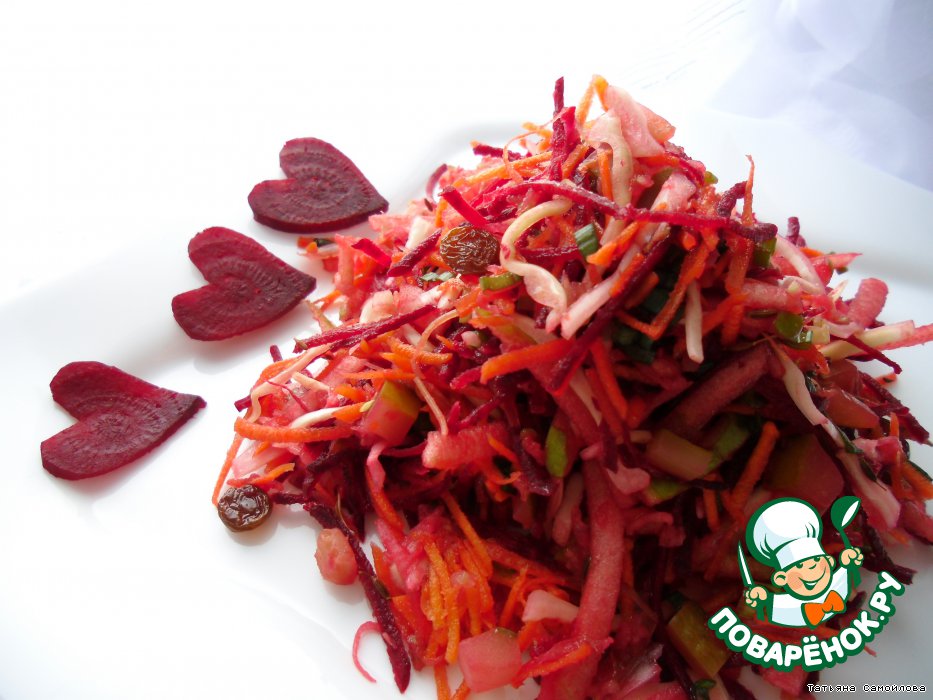 Очень вкусный салатик. Легкий, сочный овощной с изюмом, что и делает салат особенно вкусным, придавая некую изюминку.
