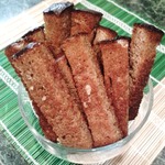 Нарезать Бородинский хлеб небольшими брусочками. Если хлеб свежий, подсушить его, оставив на разделочной доске в один ряд на пару часов.