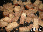 Выложить нарезанный (немного подсушенный) хлеб в сковороду и, быстро помешивая, обжарить на сильном огне до появления слабой корочки. Масло должно лишь чуть покрывать дно сковороды и полностью равномерно впитаться в хлеб.