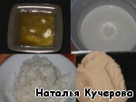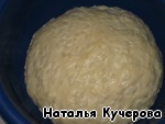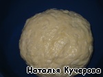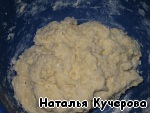 Смешать жидкую смесь с мучной и хорошенько перемешать. Получится легкая, липкая масса. Накрыть миску полотенцем и оставить отдыхать на 10 минут.