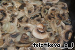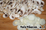 Нарезать шампиньоны пластинами, репчатый лук кольцами.