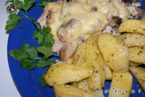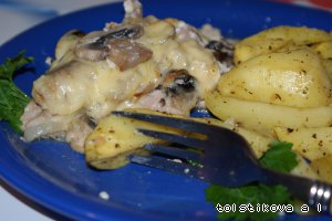 Нежное куриное филе, запеченное с шампиньонами в сырной шапке.