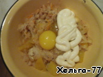 В начинку добавляем 1 яйцо и майонез (или сметану). Тщательно перемешиваем и выкладываем на тесто.