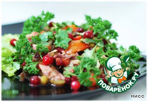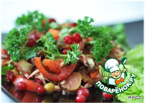 Сверху посыпаете клюквой (можно брусникой), зеленью, сервируете на листе салата.