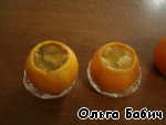 Сложить в апельсины мясо с овошами, залить соком, который образовался при запекании.