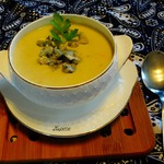 Из супа убрать лавровый лист и тимьян, пробить блендером до однородности. Влить сливки, добавить половину сыра, смесь перцев и соль по вкусу, взбить блендером еще раз.