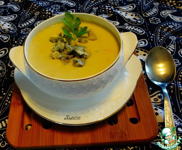 Суп нагреть и снять с огня. Перед подачей украсить оставшимся сыром и зеленью.
