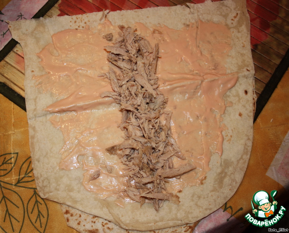 Сначала я разрезала один овальный лаваш пополам, взяла одну половинку, намазала его кетчупо-майонезом (смешать в мисочке предварительно кетчуп и майонез, желательно в равных пропорциях). Намазывать много не стоит, но вообще - по желанию.