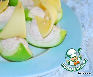 В каждую яблочную лодочку кладем начинку, кусочек сыра надевем на зубочистку в виде паруса и втыкаем в лодочку. Выкладываем на тарелку, можно украсить свежей зеленью по желанию.