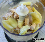Вырезанную мякоть вместе с куриным филе, майонезом и творожным сыром перемалываем в измельчителе или мелко все режем и перемешиваем.