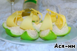 В каждую яблочную лодочку кладем начинку, кусочек сыра надевем на зубочистку в виде паруса и втыкаем в лодочку. Выкладываем на тарелку, можно украсить свежей зеленью по желанию.