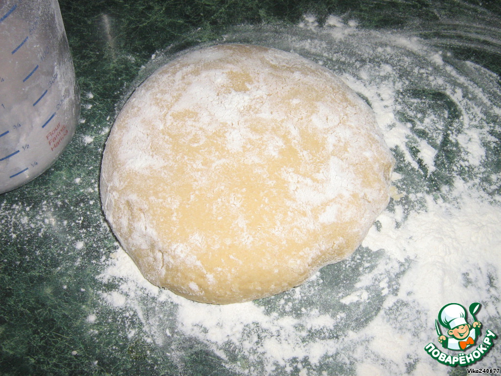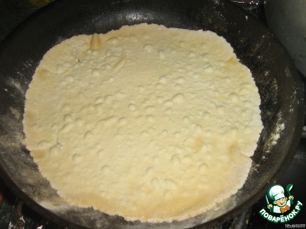 Сковороду нагреваем и посыпаем немного мукой. Выкладываем тесто на сковороду. Пласт теста тоже должен быть хорошо присыпан мукой. Брать и класть в сковороду тесто нужно осторожно, т. к. очень рвется, потому что мягкое и нежное (если правильно замешали).