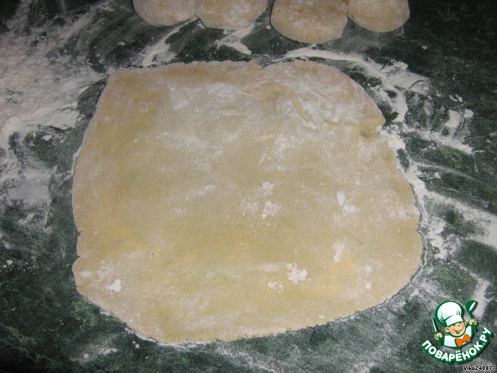 Раскатываем с размер сковороды в которой будем жарить. Пласты надо раскатывать в муке, чтобы тесто не прилипало к столу.