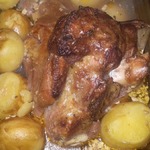 Намазываем верхнюю часть рульки смесью майонеза и горчицы, лучше брать с семенами, тогда вкус больше похож на немецкую. Чистим картофель, выкладываем вокруг рульки и запекаем при 220 град. около 40 минут.