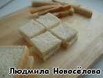 Берём хлебушек, обрезаем корочки и нарезаем как кому хочется, кругляшками, треугольничками, квадратиками.