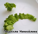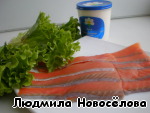 Это то, что пригодится нам далее. Рыбку тонко нарезали или купили готовую нарезку, что гораздо проще, но дороже. Листья салата помыли, обсушили.