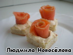 На наше поджаренное канапе щедро наносим сливочный сыр. Рыбку скручиваем рулетиком и укладываем на канапе, слегка утопая в сыр, не нужно никаких зубочисток для скрепления, всё будет держаться, как надо.