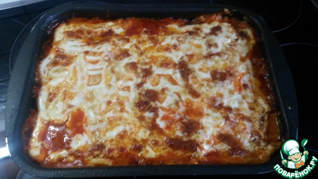 Наполнить каннеллони начинкой, сложить в форму, хорошо промазать соусом Бешамель и посыпать тертым cыром.