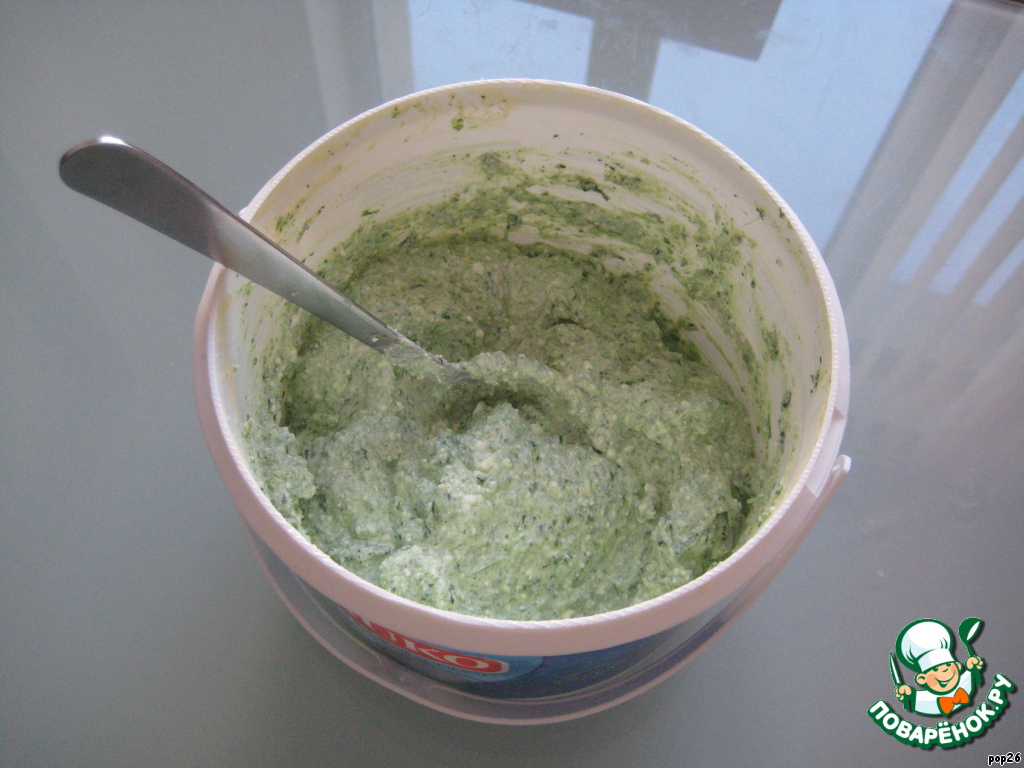 Разморозить шпинать, отжать, смешать с творогом и сыром (творожным), по необходимости посолить и поперчить.