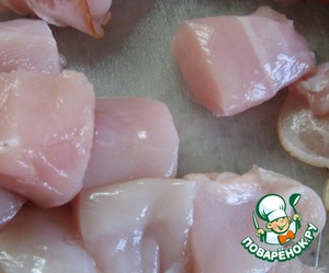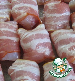 Грудку не солить, обернуть каждый кусочек в бекон.