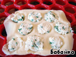 Берем пельменницу, накрываем её ломтиком сыра, в углубления выкладываем немного начинки.