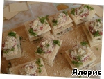 Намазываем кусочки вафель вначале рыбной смесью, накрываем сверху новым кусочком вафли...