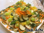 В маринад кладем листья салата, дольки яблока, огурец пластинами, укроп, виноград, несколько порезанных долек чеснока, морковь соломкой.