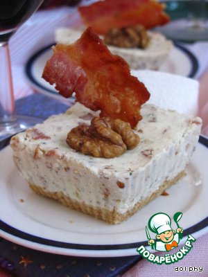 Готовый чизкейк выньте из формы. Для украшения 2 полоски бекона обжарьте до хрустящего состояния, поломайте на 3 части. Украсьте чизкейки беконом и грецким орехом.