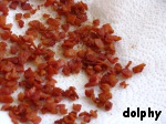 6 полосок бекона измельчите и обжарьте на сковороде до хрустящего состояния (примерно 10 минут). Переложите на салфетку, чтобы стек лишний жир.