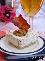 Готовый чизкейк выньте из формы. Для украшения 2 полоски бекона обжарьте до хрустящего состояния, поломайте на 3 части. Украсьте чизкейки беконом и грецким орехом.