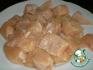 Куриное филе помыть и порезать на квадратики, порезанное филе посолить и поперчить.