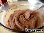 Всыпать муку + какао и аккуратно, ложкой, вымесить мягкое тесто.