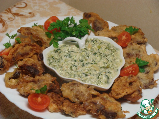 Мягкий овощной соус с явными нотками чеснока отлично оттеняет пряный вкус куриных желудочков, а хрустящий кляр придаёт блюду пикантность.