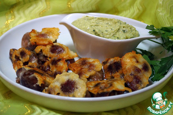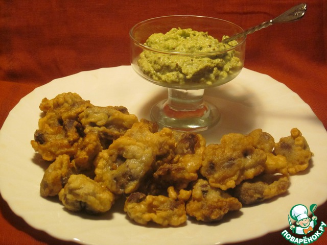 Куриные желудки в коньячном кляре и зелeный соус из брокколи к ним