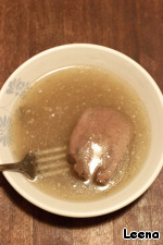 Для желе желатин предварительно замачиваем в стакане холодной кипяченой воды. Когда он разбух, добавляем его в 300-400 мл ГОРЯЧЕГО процеженного бульона и размешиваем до растворения.