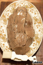 Заливное из говяжьего языка - старинная русская закуска под водочку. Предлагаю вашему вниманию интересную вариацию на эту тему. Блюдо представляет собой две самостоятельные закуски, которые прекрасно дополняют друг друга. Это собственно язык и нежная, пикантная хлебная основа. Если закуска следует сразу за небольшим глотком прохладной водки, вкус блюда многократно усиливается. Хорошо к языку подать хрен или горчицу, которые увеличат его гастрономическую привлекательность и оттенят вкусовые свойства. На столе выглядит очень празднично и эффектно! Хочу этим рецептом поздравить мужчин, а также всех защитников нашего Отечества с наступающим 23 февраля! P. S. Вчера к нам в гости приходили бельгийцы, на них мы и провели испытание этого блюда. Они очень отметили его своим вниманием среди прочих закусок! При этом увлеклись не только языком, но и хлебной основой, на которой он лежал, с любопытством спрашивали из чего она сделана :-D