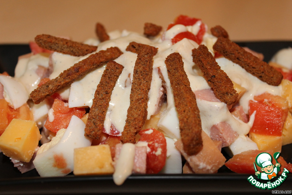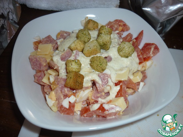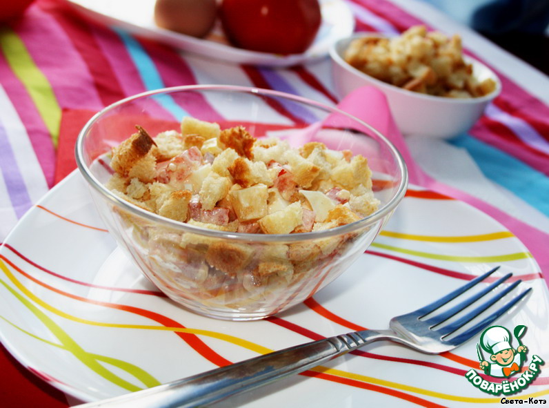 Выкладываем в чашечку салат и посыпаем сверху сухариками.