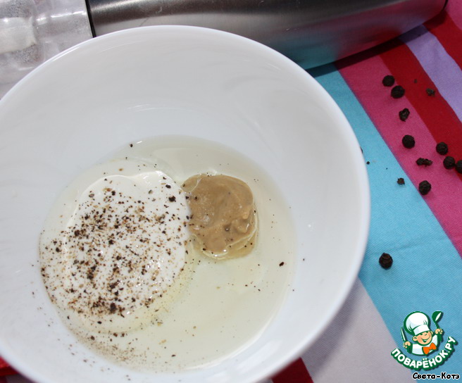 Заправка. Смешиваем сметану, горчицу, масло, перец – и в салат.