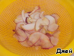 Посыпаем тесто сахаром и внахлёст укладываем яблочки