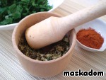 Зелень измельчаем в комбайне вместе со смесью, перетертой в ступке, и паприкой, добавляем 2 столовых ложки лимонного сока и 2 столовых ложки оливкового масла, можно подсолить по вкусу. В результате получается смесь, похожая на пасту. Если нет комбайна, зелень просто можно очень мелко порубить и перетереть в ступке с остальными компонентами.