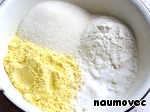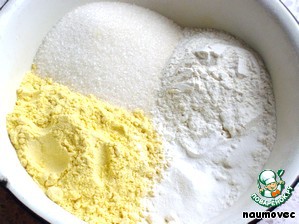 Муку (кукурузную и пшеничную) просеиваем, смешиваем с сахаром, разрыхлителем и содой.