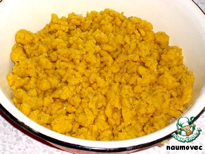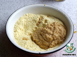 Эту массу смешиваем с мукой и замешиваем мягкое крошащееся тесто. Если нужно, добавляем воду или муку (любую). Мне не понадобилось. Если нет кукурузной муки, можно взять только пшеничную, но с кукурузной вкуснее.