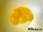 Желтки пяти яиц отделить от белков. Растереть с маслом до однородности. Добавить сахарную пудру, кефир, воду/молоко. Взбить.