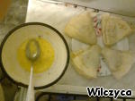 В центр блина выкладываем начинку, сворачиваем его, обмакиваем в яйцо.