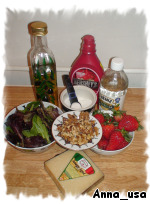 Для начала приготовим заправку. В небольшой закрывающейся банке смешиваем оливковое масло, сахар, уксус, клубничный сироп и клубничный ликёр(если вы его используете).