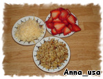 Клубнику помыть, обсушить и порезать слайсами. Сыр натереть на крупной тёрке, орехи порезать не очень мелко.