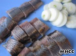Нарезаем селёдку на кусочки. Чистим лук, нарезаем кольцами.