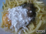 В натёртый картофель кладём яйцо, крахмал, мускатный орех, сухой укроп, соль.
