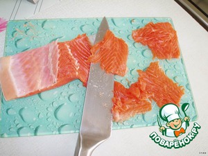Тем временем пластуем рыбу, по ходу вынимая косточки. Если рыба мороженая, размораживать не надо. Мороженую рыбу резать легче - кусочки получаются тоньше и аккуратнее.